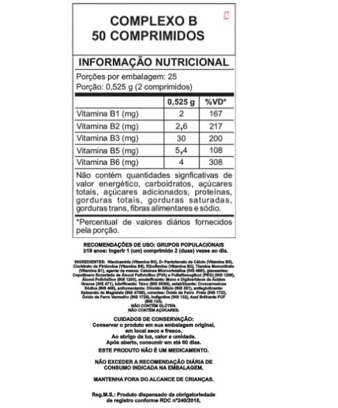 COMPLEXO B 50 COMPRIMIDOS – ARTE NATIVA   DESCRIÇÃO A niacina contribui para a manutenção da pele e auxilia no metabolismo de proteínas, carboidratos e gorduras. A vitamina B6 auxilia no funcionamento do sistema imune e na formação de células vermelhas do sangue. Ácido pantotênico auxilia no metabolismo energético. A riboflavina auxilia na formação de células vermelhas do sangue e é um antioxidante que auxilia na proteção dos danos causados pelos radicais livres. A tiamina auxilia no metabolismo de proteínas, carboidratos e gorduras e no metabolismo energético.   BENEFÍCIOS - 5 Vitaminas do Complexo B; - Alto rendimento; - Auxilia no metabolismo energético; - Auxilia no metabolismo de proteínas, carboidratos e gorduras; - Contribui para a manutenção da pele, olhos e cabelos; - Ajuda na atividade física; - Não contém glúten; - Não contém açúcares.   SUGESTÃO DE USO ≥ 19 anos: Ingerir 1 comprimido 2 (duas) vezes ao dia.   TABELA NUTRICIONAL - COMPOSIÇÃO e RECOMENDAÇÕES Anexo nas imagens.   DADOS TÉCNICOS Registro ANVISA – Produto dispensado da obrigatoriedade de registro de conforme RDC nº240/2018. Marca – Arte Nativa. Conteúdo líquido por frasco – 50 comprimidos. Rendimento líquido por frasco – 25 doses/porções.       Peso líquido por frasco – 13,13g. Peso bruto por frasco – 34g. Peso produto + embalagem(aproximado) – 150g. Código de barras (EAN) – 7898277713258. Dimensões do produto – largura: 4cm; altura: 9,5cm; comprimento: 4cm. Dimensões da embalagem/pacote – largura: 13 cm; altura: 7 cm; comprimento: 16 cm.   ITENS DO ANÚNCIO 1 Unidade do produto COMPLEXO B 50 COMPRIMIDOS – ARTE NATIVA. Total – 50 comprimidos CADA FRASCO.