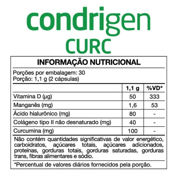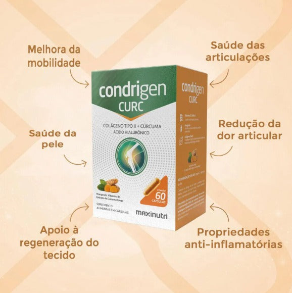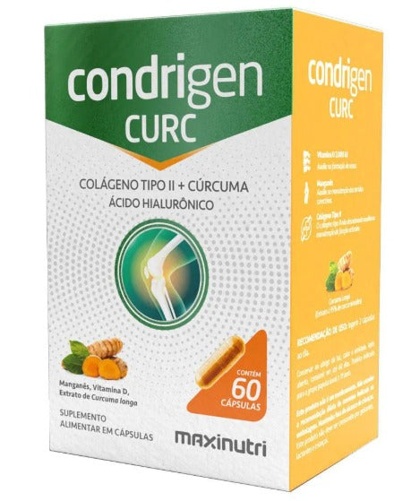 NÃO CONTÉM GLÚTEN. NÃO ENGORDA. Zero açúcar. Este produto é Original Maxinutri. Somos revendedor Autorizado da Marca. Validade do Produto: 24 Meses após a Fabricação. Só enviamos Lotes Recentes. Uma combinação única de colágeno tipo II, ácido hialurônico, curcumina, manganês e vitamina d. Disponível em apresentações de 60 cápsulas, Condrigen Curc oferece uma experiência completa de cuidado. Transforme sua rotina de bem-estar com Condrigen Curc, onde cada cápsula é um impulso para um corpo mais saudável e uma vida mais ativa. COLÁGENO TIPO II + CÚRCUMA + ÁCIDO HIALURÔNICO + MANGANÊS + vitamina D COLÁGENO TIPO II NÃO DESNATURADO: Auxilia na manutenção da função articular. MANGANÊS: Auxilia na manutenção dos tecidos conectivos. VITAMINA D: Auxilia na formação de ossos. Ingestão diária recomendada: Ingerir 2 cápsulas ao dia. Ingredientes: Extrato de rizomas de Curcuma longa (Curcumina), hialuronato de sódio obtido pela fermentação de Streptococcus zooepidemicus (Ácido hialurônico), colágeno de frango com colágeno tipo II não desnaturado (Colágeno tipo II), bisglicinato de manganês (Manganês), colecalciferol (Vit. D3) e amido; Antiumectantes: silicato de magnésio hidratado (Talco), estearato de magnésio e dióxido de silício; Estabilizante: polivinilpirrolidona insolúvel; Cápsula: Gelificante: gelatina. Conservação: Conservar ao abrigo da luz, calor e umidade. Após aberto, consumir em até 60 dias. Advertências: Produto indicado para o grupo populacional igual ou maior que 19 anos. Não exceder a recomendação diária de consumo indicada na embalagem. Mantenha fora do alcance de crianças. Este produto não deve ser consumido por gestantes, lactantes e crianças.