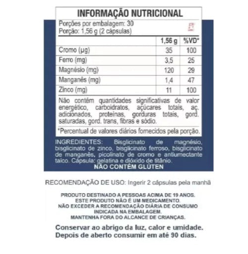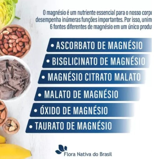Óxido de Magnésio, Bisglicinato de Magnésio, Ascorbato de Magnésio, Magnésio Citrato Malato, Malato de Magnésio, Taurato de Magnésio. Antiumectantes: estearato de magnésio, silicato de magnésio, celulose microcristalina. Composição da cápsula: gelatina. Não contém glúten.