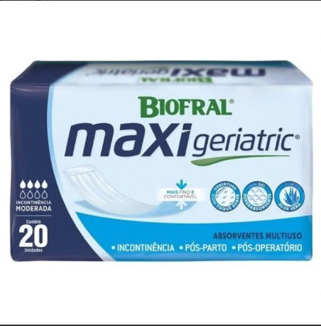Biofral Maxi Geriatric é um absorvente descartável multiuso, indicado para incontinência urinária moderada.