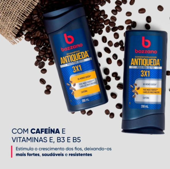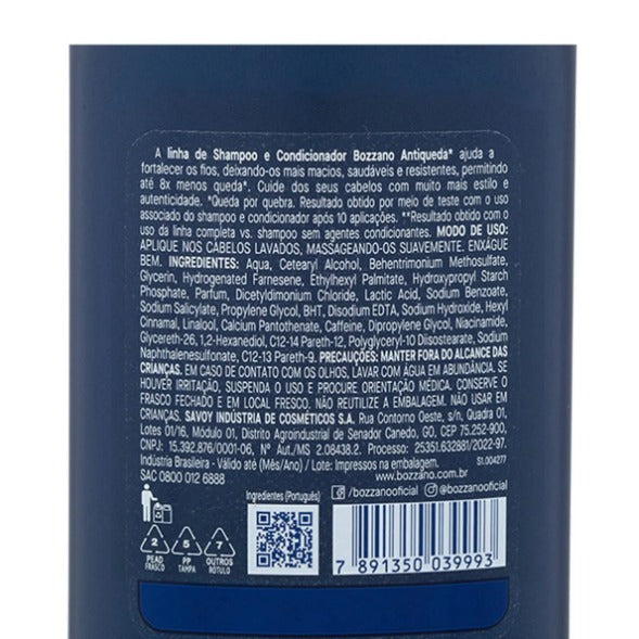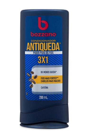O condicionador Bozzano Antiqueda 3 em 1 foi desenvolvido com cafeína e vitaminas E, B3 e B5. Oferecendo até 8x menos queda, ele ajuda a fortalecer e estimula o crescimento dos fios, garantindo um cabelo mais macio, saudável e resistente, além de fios mais brilhantes.