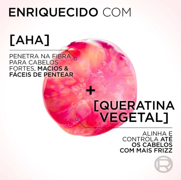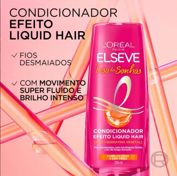 Com fórmula enriquecida com AHA + Queratina Vegetal, o Condicionador Elseve Liso dos Sonhos proporciona fios lisos e à prova de umidade.