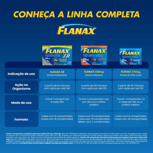 Flanax® é contraindicado em pessoas que apresentem alergia ao naproxeno ou a outro componente do medicamento; que tenham apresentado crise de asma, urticária ou outras reações alérgicas pelo uso de ácido acetilsalicílico ou outros anti-inflamatórios não esteroides (AINEs); em pessoas com histórico de sangramento ou perfuração gastrointestinal relacionado ao uso de anti-inflamatórios não esteroidais; pacientes com antecedente ou história atual de úlcera péptica ou hemorragia (dois ou mais episódios que comprovem ulceração ou sangramento) e em pessoas com insuficiência cardíaca grave.