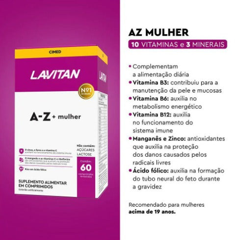O Lavitan A-Z Mulher é um suplemento vitamínico mineral em comprimidos, específico para complementar as necessidades nutricionais femininas. Associado a uma dieta equilibrada, fornece vitaminas e minerais essenciais para o organismo feminino.